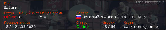 Играет на Team Fortress 2 сервере. Страна: РоссияПервый раз замечен 18:36 24.03.2026