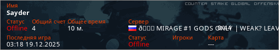 Играет на Counter Strike Global Offensive сервере. Страна: РоссияПервый раз замечен 03:01 19.12.2025