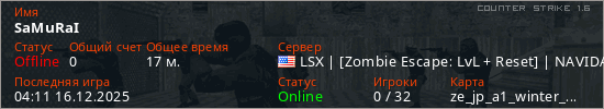 Играет на Counter Strike 1.6 сервере. Страна: СШАПервый раз замечен 03:54 16.12.2025