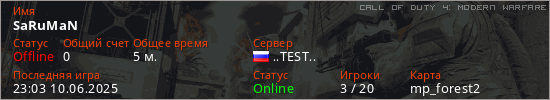 Играет на Call of Duty 4: Modern Warfare сервере. Страна: РоссияПервый раз замечен 23:00 10.06.2025