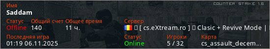 Играет на Counter Strike 1.6 сервере. Страна: РумынияПервый раз замечен 02:11 11.12.2024