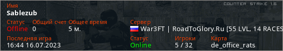 Играет на Counter Strike 1.6 сервере. Страна: РоссияПервый раз замечен 16:42 16.07.2023