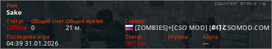 Играет на Counter Strike 1.6 сервере. Страна: РоссияПервый раз замечен 14:36 22.01.2026