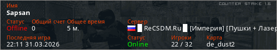 Играет на Counter Strike 1.6 сервере. Страна: РоссияПервый раз замечен 22:02 31.03.2026