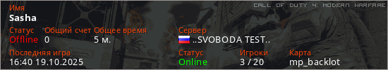 Играет на Call of Duty 4: Modern Warfare сервере. Страна: РоссияПервый раз замечен 15:39 19.10.2025