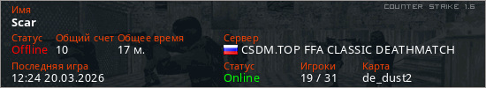 Играет на Counter Strike 1.6 сервере. Страна: РоссияПервый раз замечен 18:01 16.03.2026