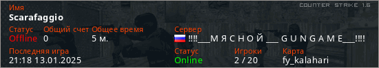 Играет на Counter Strike 1.6 сервере. Страна: РоссияПервый раз замечен 21:16 13.01.2025