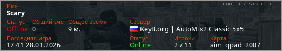Играет на Counter Strike 1.6 сервере. Страна: РоссияПервый раз замечен 17:24 28.01.2026