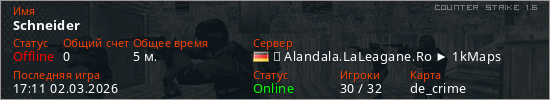 Играет на Counter Strike 1.6 сервере. Страна: ГерманияПервый раз замечен 17:07 02.03.2026