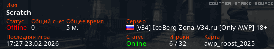 Играет на Counter Strike Source сервере. Страна: РоссияПервый раз замечен 17:20 23.02.2026