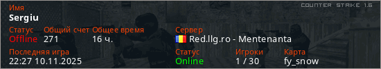 Играет на Counter Strike 1.6 сервере. Страна: РумынияПервый раз замечен 18:15 13.07.2022