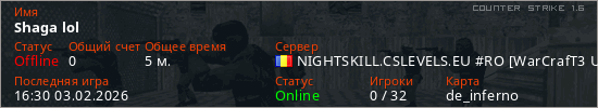 Играет на Counter Strike 1.6 сервере. Страна: РумынияПервый раз замечен 16:28 03.02.2026