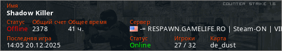 Играет на Counter Strike 1.6 сервере. Страна: СШАПервый раз замечен 00:41 10.09.2025