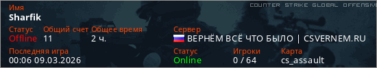 Играет на Counter Strike Global Offensive сервере. Страна: РоссияПервый раз замечен 20:58 04.03.2026