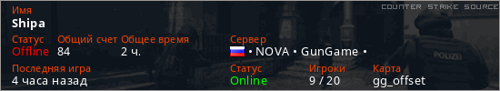 Играет на Counter Strike Source сервере. Страна: РоссияПервый раз замечен 12:21 19.03.2026