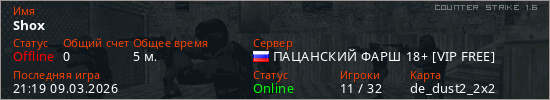 Играет на Counter Strike 1.6 сервере. Страна: РоссияПервый раз замечен 21:09 09.03.2026