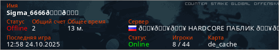 Играет на Counter Strike Global Offensive сервере. Страна: РоссияПервый раз замечен 17:20 03.10.2025