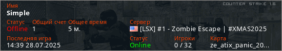 Играет на Counter Strike 1.6 сервере. Страна: СШАПервый раз замечен 14:37 28.07.2025