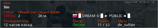 Последний раз был в сети 11 часов назад Игрок с таким ником замечен на 20 серверах