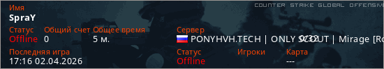 Играет на Counter Strike Global Offensive сервере. Страна: РоссияПервый раз замечен 16:25 02.04.2026