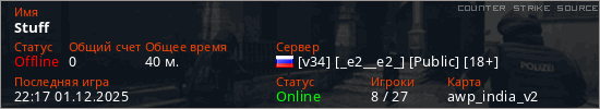 Играет на Counter Strike Source сервере. Страна: РоссияПервый раз замечен 22:15 01.12.2025