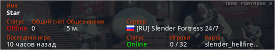 Играет на Team Fortress 2 сервере. Страна: РоссияПервый раз замечен 10:15 30.03.2026