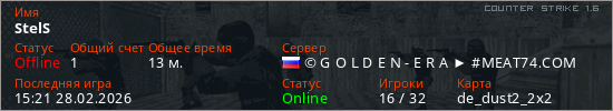 Играет на Counter Strike 1.6 сервере. Страна: РоссияПервый раз замечен 19:16 26.02.2026