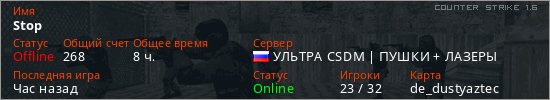 Играет на Counter Strike 1.6 сервере. Страна: РоссияПервый раз замечен 12:36 04.11.2025
