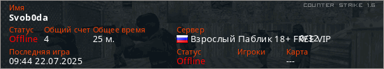 Играет на Counter Strike 1.6 сервере. Страна: РоссияПервый раз замечен 17:34 12.07.2025