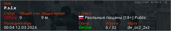 Играет на Counter Strike 1.6 сервере. Страна: РоссияПервый раз замечен 15:16 09.03.2024