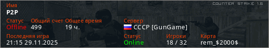 Играет на Counter Strike 1.6 сервере. Страна: РоссияПервый раз замечен 13:18 13.12.2024