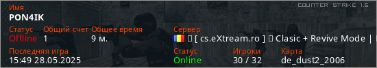 Играет на Counter Strike 1.6 сервере. Страна: РумынияПервый раз замечен 12:36 28.05.2025