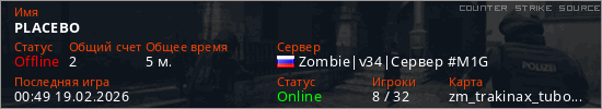 Играет на Counter Strike Source сервере. Страна: РоссияПервый раз замечен 00:26 19.02.2026