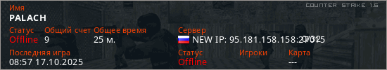 Играет на Counter Strike 1.6 сервере. Страна: РоссияПервый раз замечен 14:58 31.08.2025