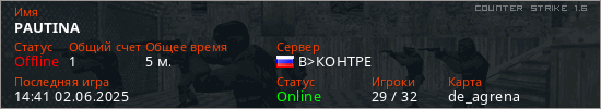 Играет на Counter Strike 1.6 сервере. Страна: РоссияПервый раз замечен 14:39 02.06.2025