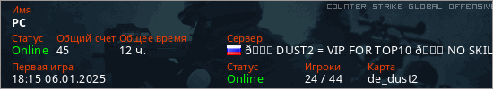 Играет на Counter Strike Global Offensive сервере. Страна: РоссияПервый раз замечен 18:15 06.01.2025
