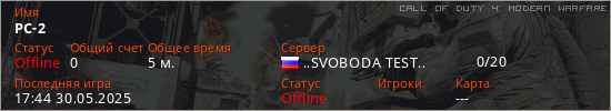 Играет на Call of Duty 4: Modern Warfare сервере. Страна: РоссияПервый раз замечен 17:42 30.05.2025