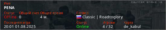 Играет на Counter Strike 1.6 сервере. Страна: РоссияПервый раз замечен 19:30 01.08.2025