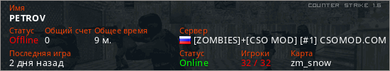 Играет на Counter Strike 1.6 сервере. Страна: РоссияПервый раз замечен 19:27 20.03.2026
