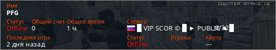 Играет на Counter Strike 1.6 сервере. Страна: РоссияПервый раз замечен 06:15 12.03.2026