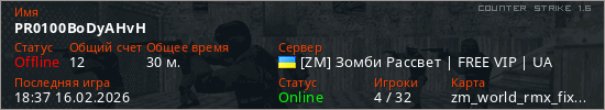 Играет на Counter Strike 1.6 сервере. Страна: УкраинаПервый раз замечен 14:41 14.02.2026
