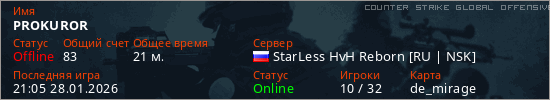 Играет на Counter Strike Global Offensive сервере. Страна: РоссияПервый раз замечен 16:18 27.01.2026