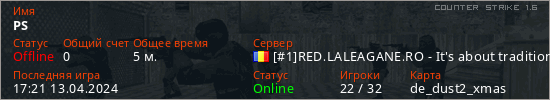 Играет на Counter Strike 1.6 сервере. Страна: РумынияПервый раз замечен 17:19 13.04.2024
