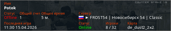 Играет на Counter Strike 1.6 сервере. Страна: РоссияПервый раз замечен 11:28 15.04.2026