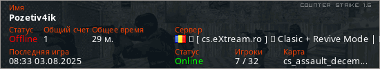 Играет на Counter Strike 1.6 сервере. Страна: РумынияПервый раз замечен 03:19 30.06.2025