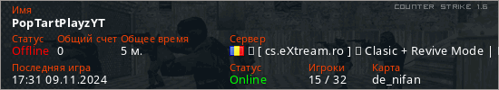 Играет на Counter Strike 1.6 сервере. Страна: РумынияПервый раз замечен 17:29 09.11.2024