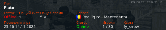 Играет на Counter Strike 1.6 сервере. Страна: РумынияПервый раз замечен 23:35 14.11.2025