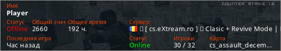 Играет на Counter Strike 1.6 сервере. Страна: РумынияПервый раз замечен 16:31 22.10.2024