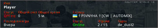 Последний раз был в сети Вчера Игрок с таким ником замечен на 75 серверах