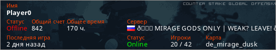 Последний раз был в сети 2 дня назад Игрок с таким ником замечен на 68 серверах
